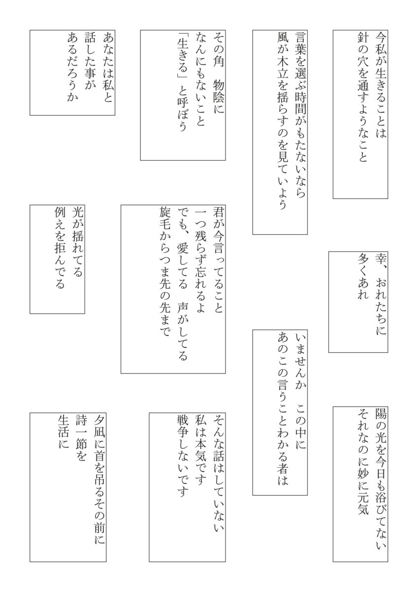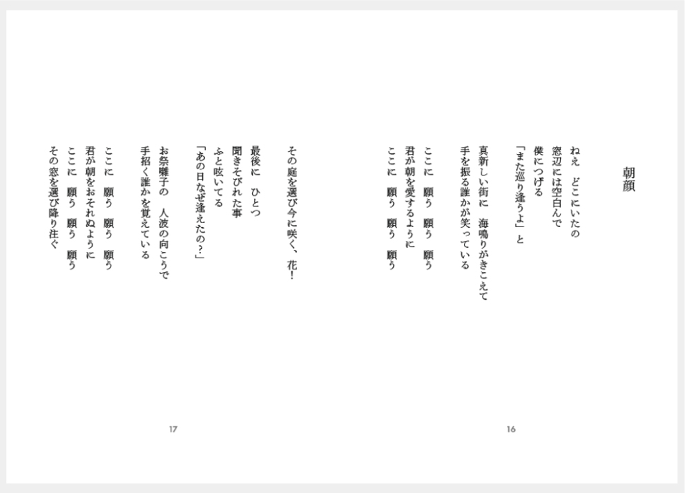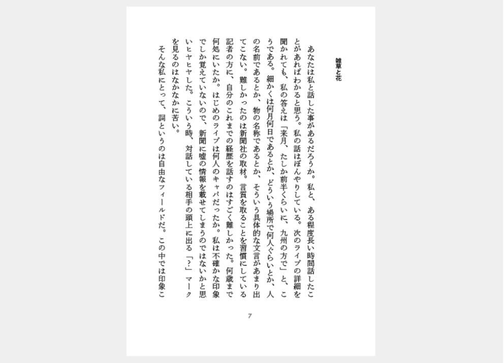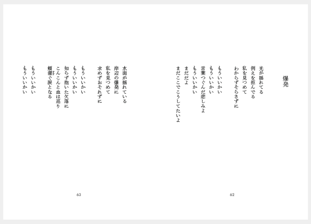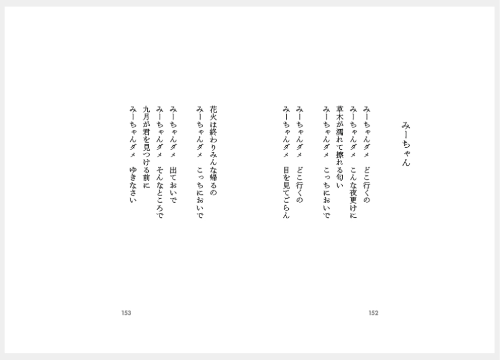 歌に乗せて“聴く”だけの言葉ではない、読み、想像し、対話するものとしてこの(歌)詞集をつくりました。ひとり静かにこの本を開き、自分だけの読み方で時間を過ごしていただけたらうれしいです。