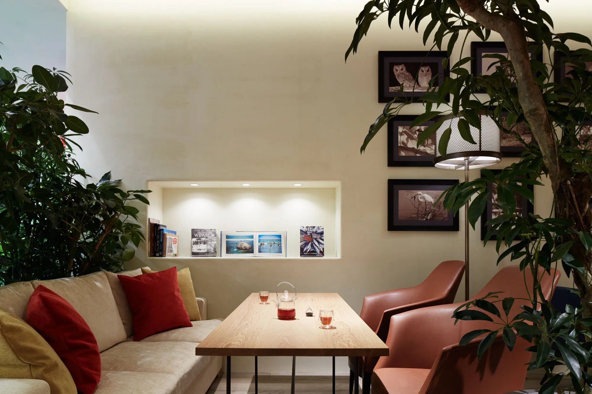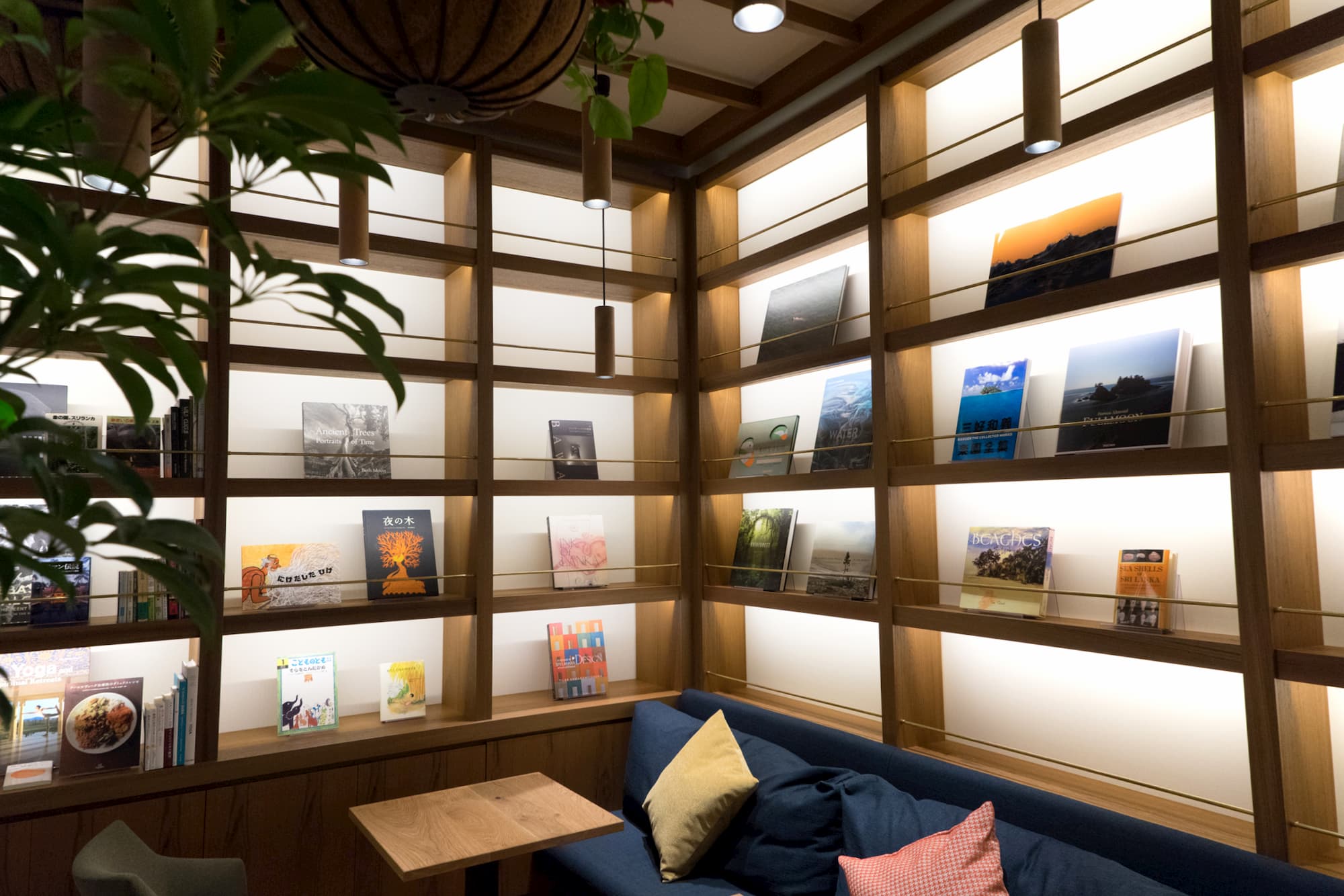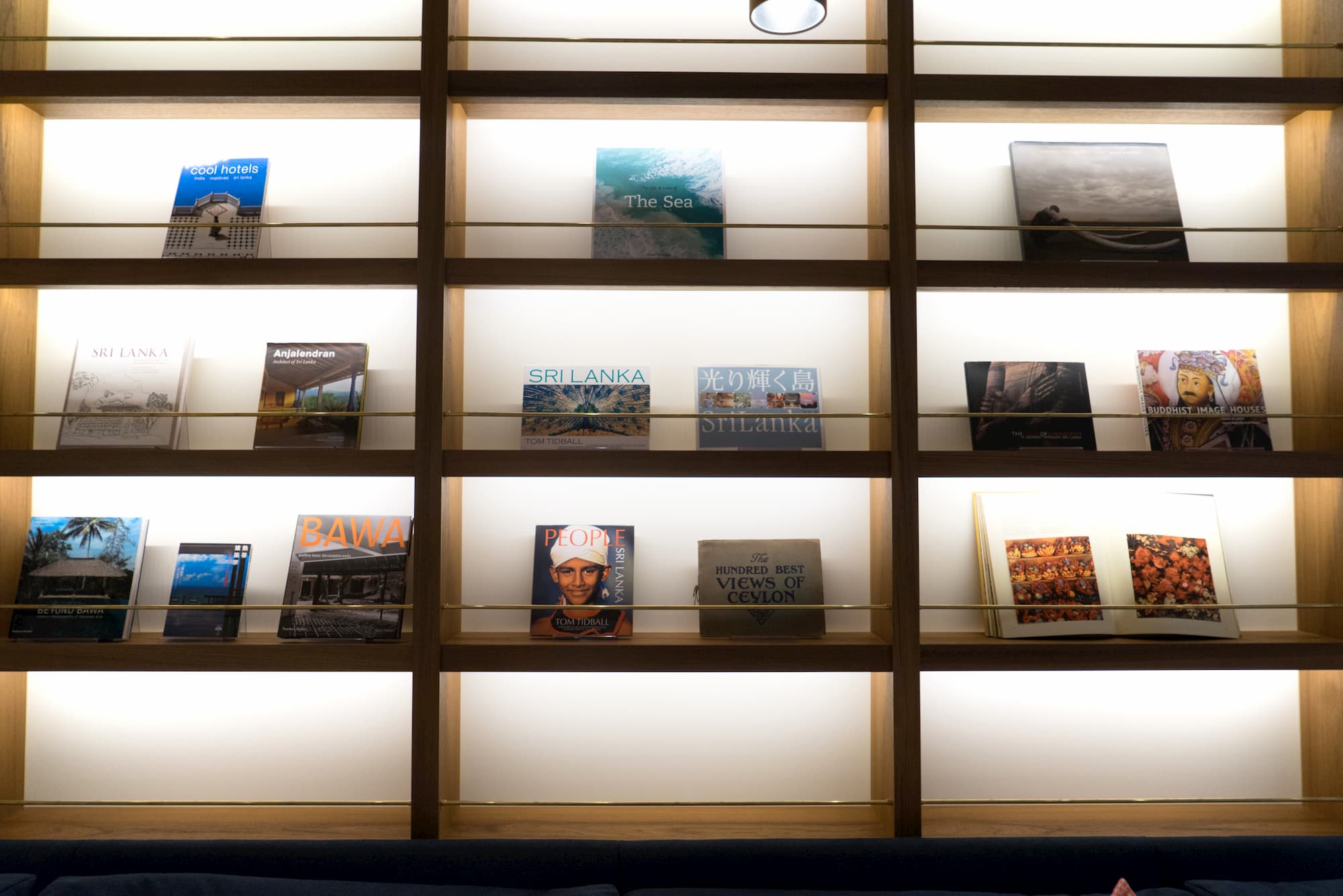 本の蔵書量や読んでほしいと強く訴えるようなディスプレイは、ラウンジという場所が最も大事にすべき寛ぎと歓談のあり方からずれてしまうため、面での陳列を中心とし、コンセプトであるスリランカの空気感の演出としても十分機能するように並べている。