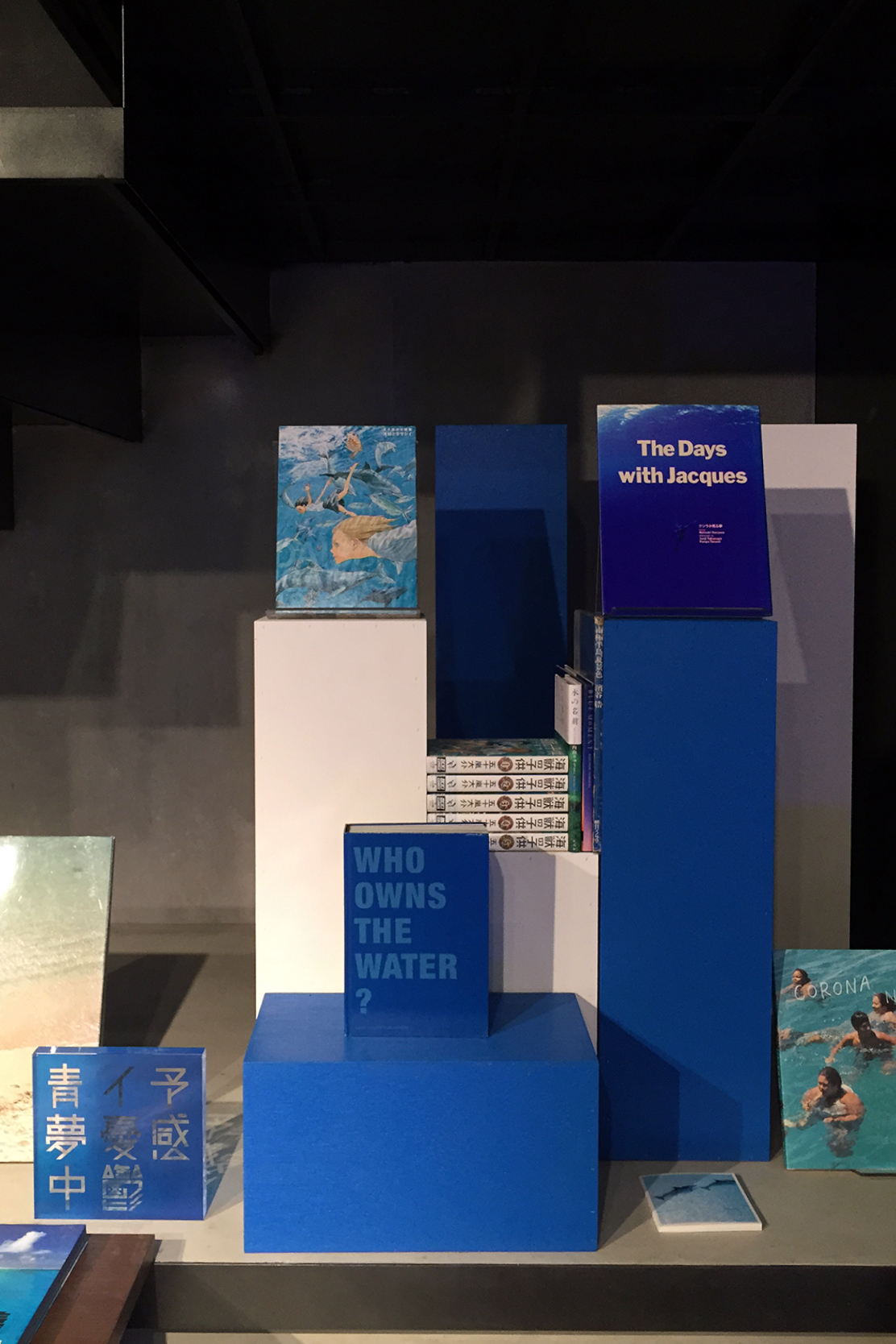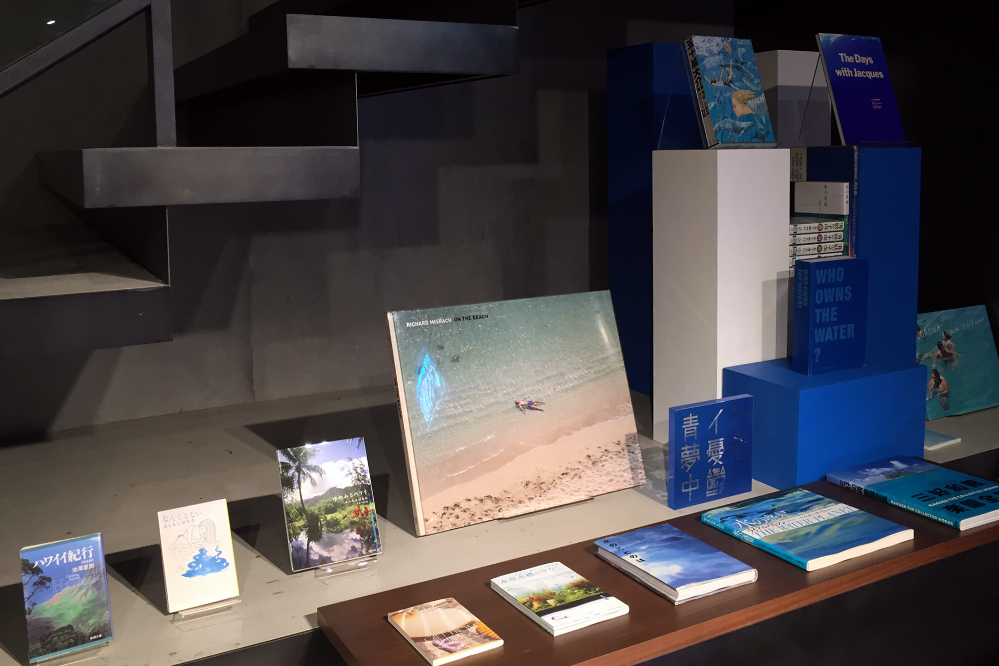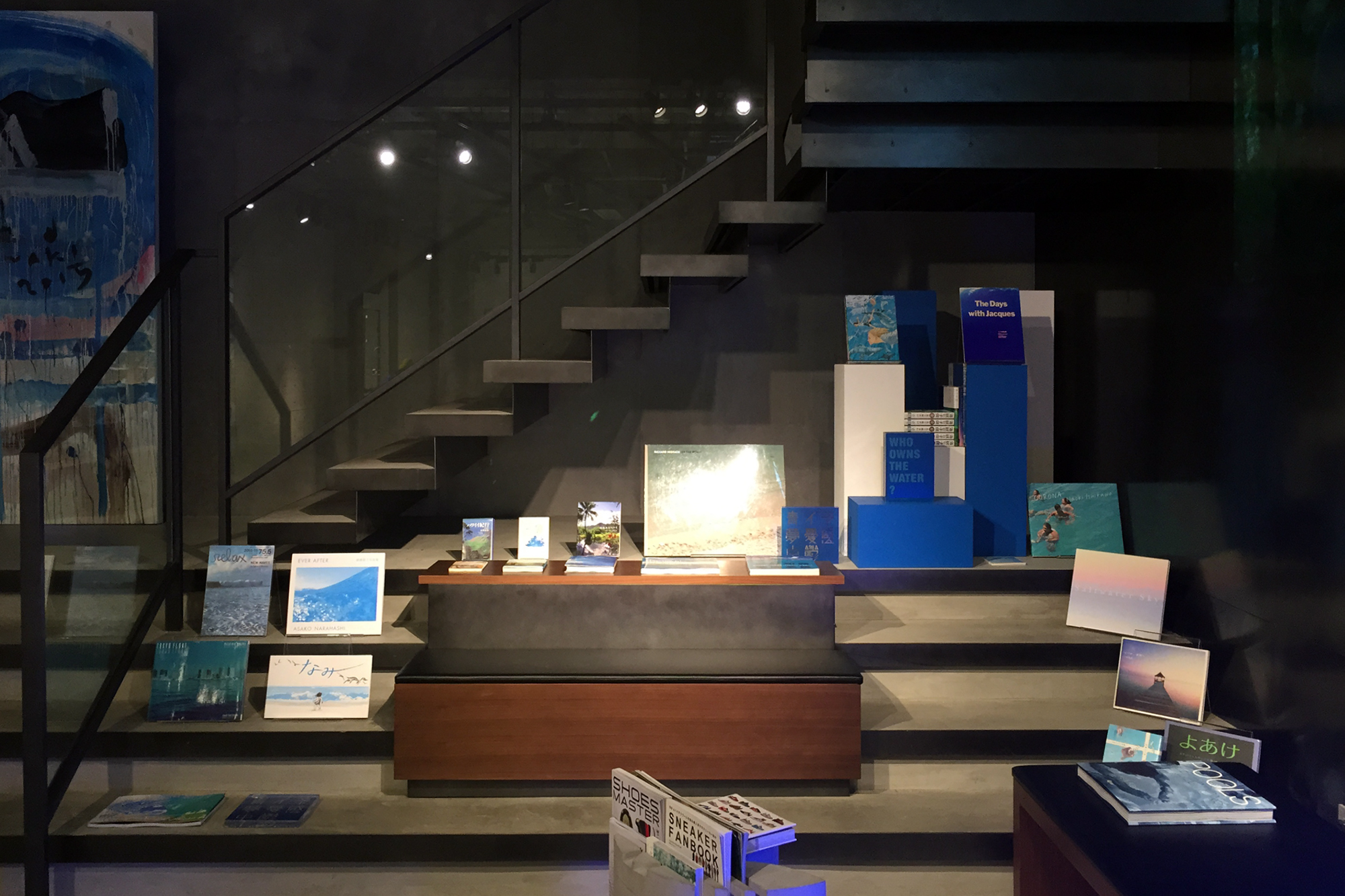 また、地下1階と2階にはオリジナルスのキーカラー“青”から展開し、地下には水/海の青について、2階には光/空の青についての選書を行った。青のディスプレイとしての効果を備えながら、水/海と光/空を青という切り口で選んだ本には、生きることや運動すること、自由でいることなど様々なテーマやアイディアが込められていた。