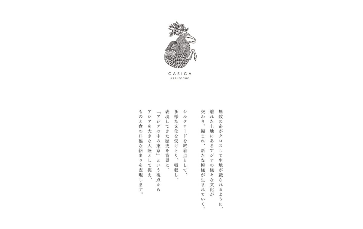 「CASICA KABUTOCHO」は、「アジアの中の東京」をキーワードにアジアの路地裏にある荒物屋のような小物から茶器やアートピース、インテリア雑貨が揃うショップと、日本を含むアジア全域を一つの大陸と捉え、「Cross Continental Cuisine」をコンセプトにしたレストラン「可視化飯店」からなる複合店舗。