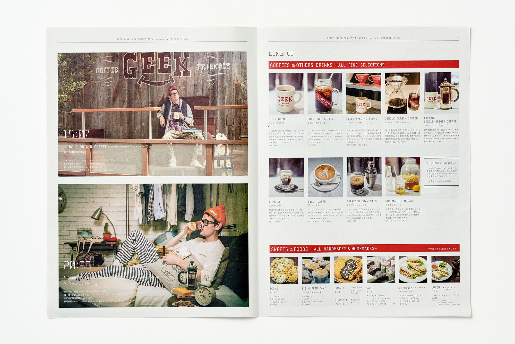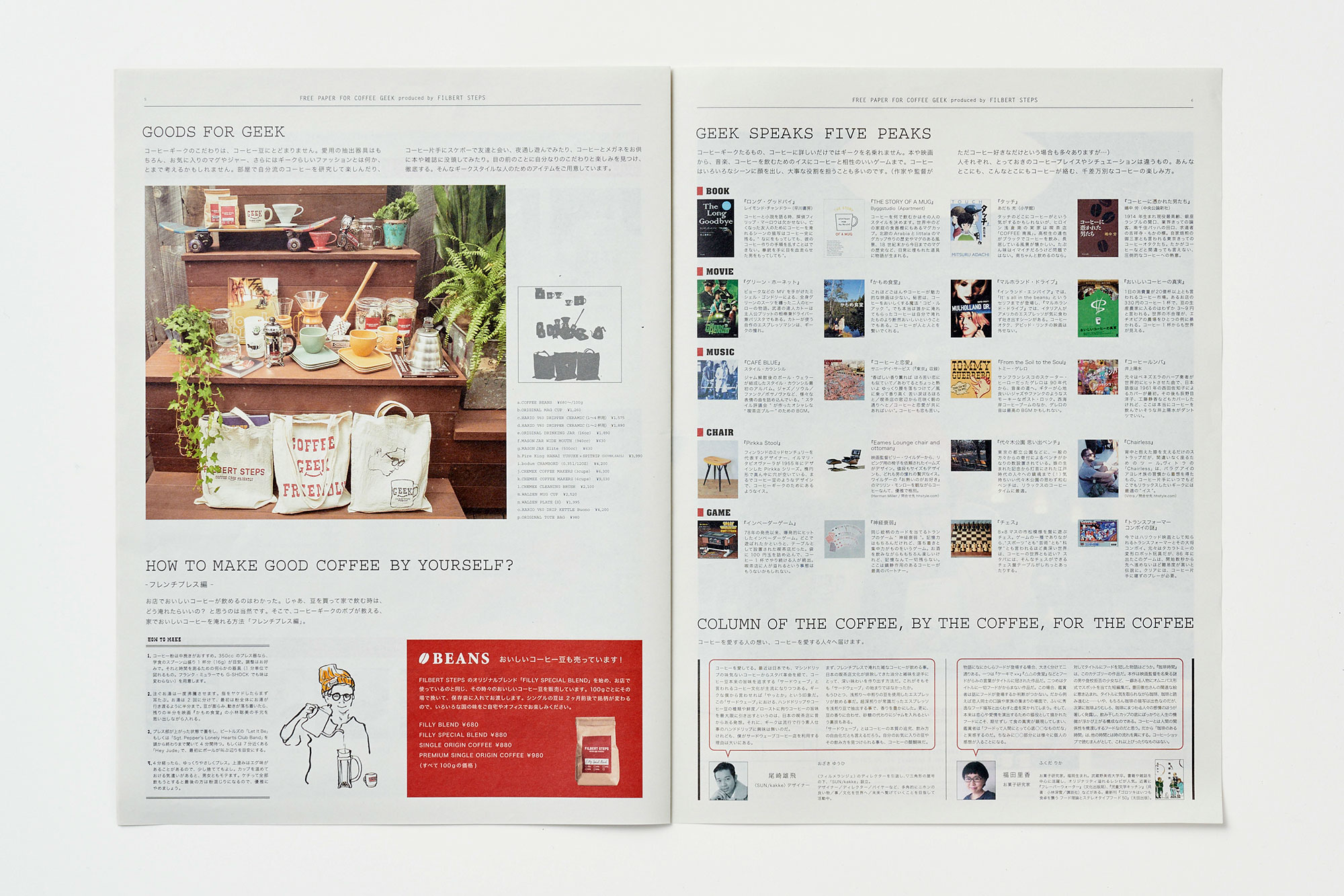 オープンに合わせて製作したタブロイドは、COFFEE GEEKをイメージしたシューティングを行い、音楽や本のレビューなども掲載。ベイクルーズが展開するファッション的な感覚から出発し、コーヒー好きが愛する様々なカルチャーを紹介している。