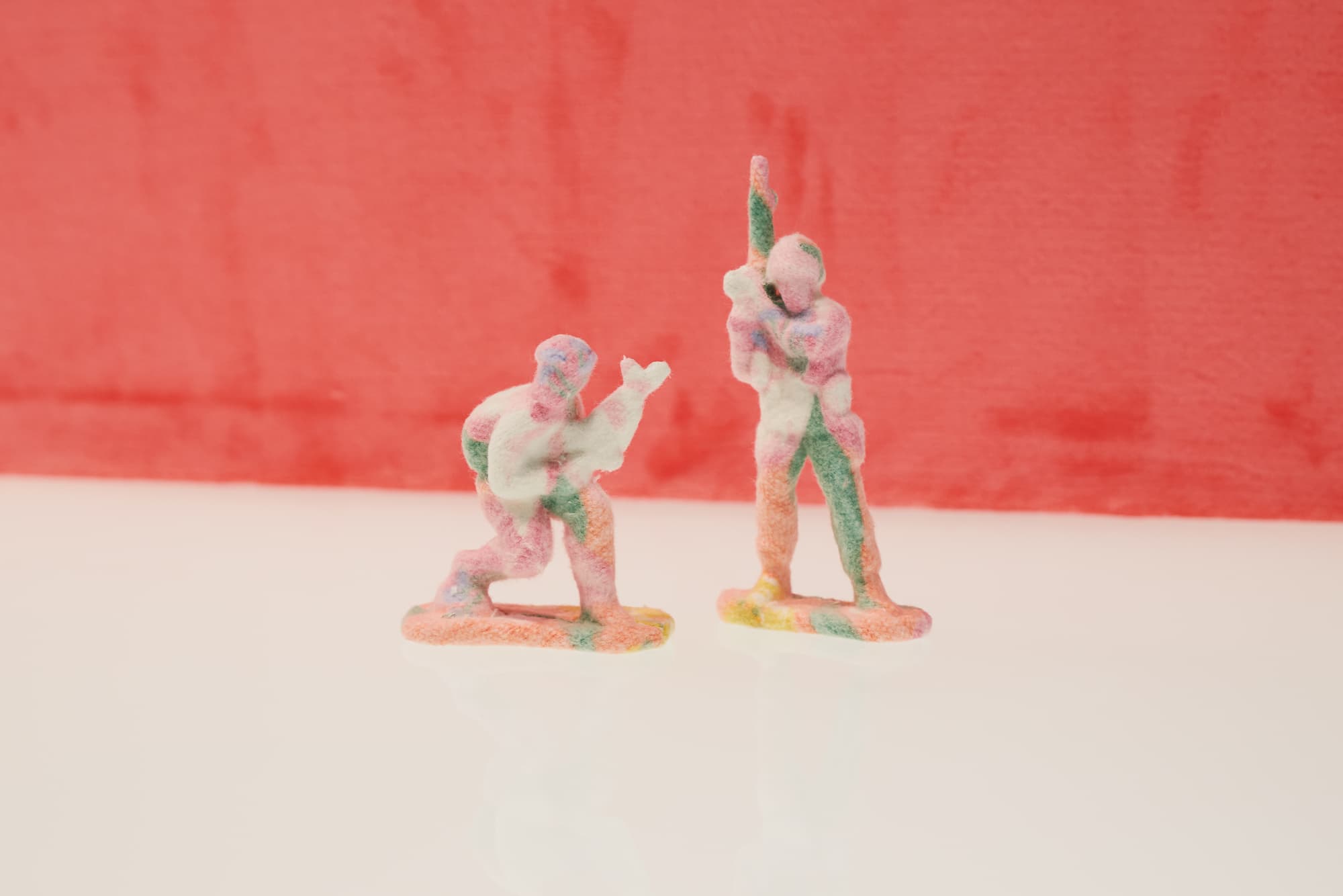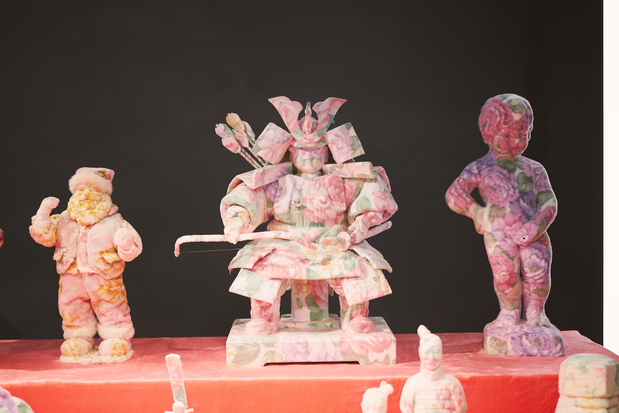 江頭の作品は、あらゆるものを花柄の毛布で包んでしまうことで、それぞれの個性は一度消失しながらも改めて毛布越しにぼんやりと現れてくる。ブランドなどの表層的な個性は消えるが、物としての輪郭や構造、立ち姿は残る。消えながら残る個性に、我々は何を見出すことが可能か。微細なマイナーチェンジ、モデルチェンジで消費を煽る/煽られる物と人間の関係を再確認する。